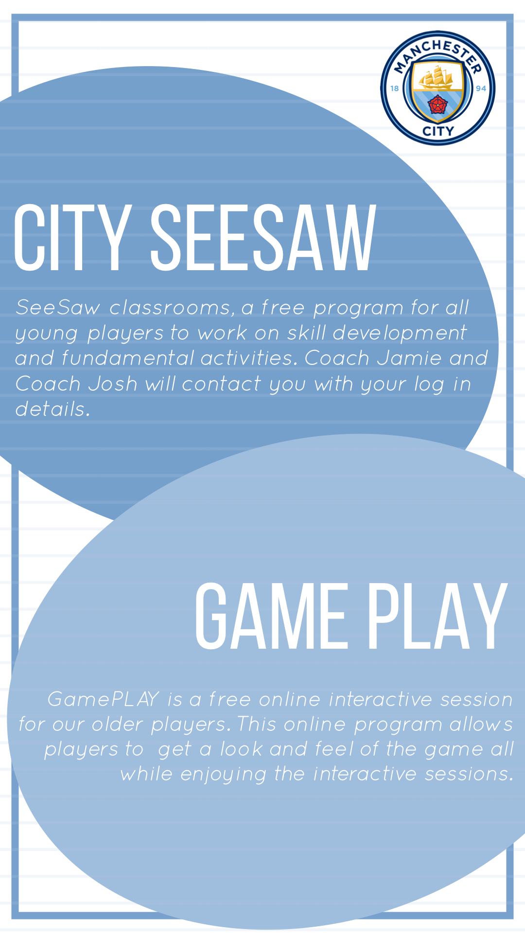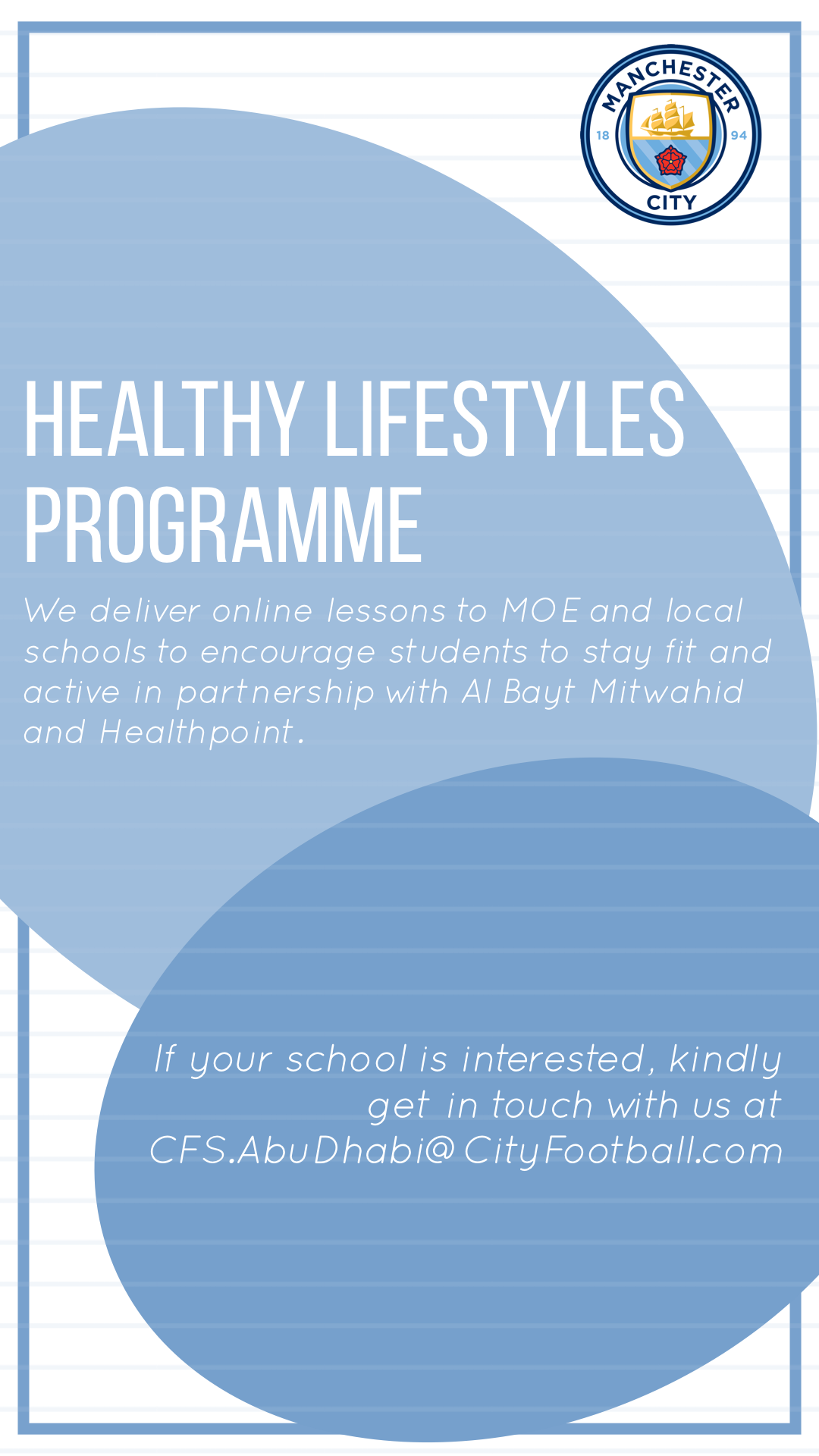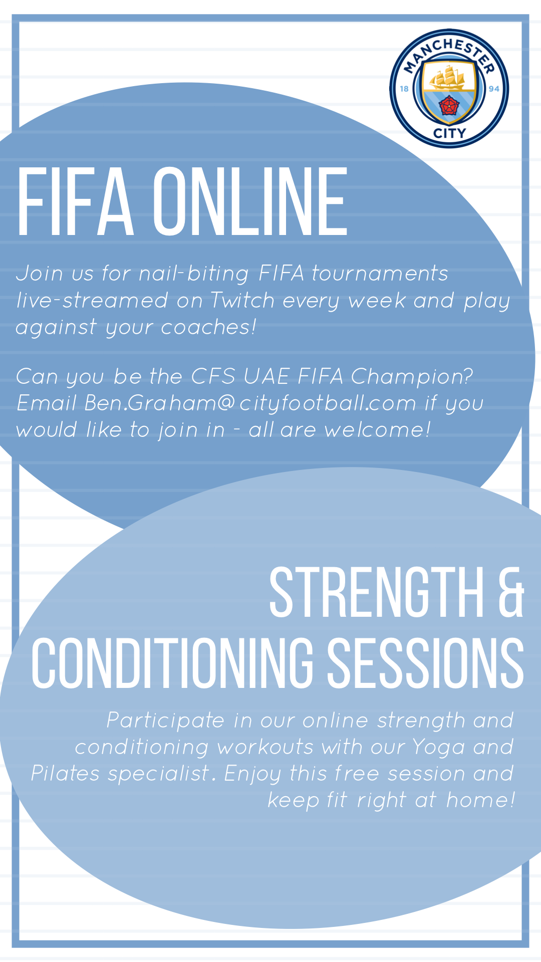 City Football Schools are offering lots of free ways to train and stay fit at home. Check out what’s available below and email CFS.AbuDhabi@cityfootball.com for coaches to add you into sessions. Have fun finessing your football skills!